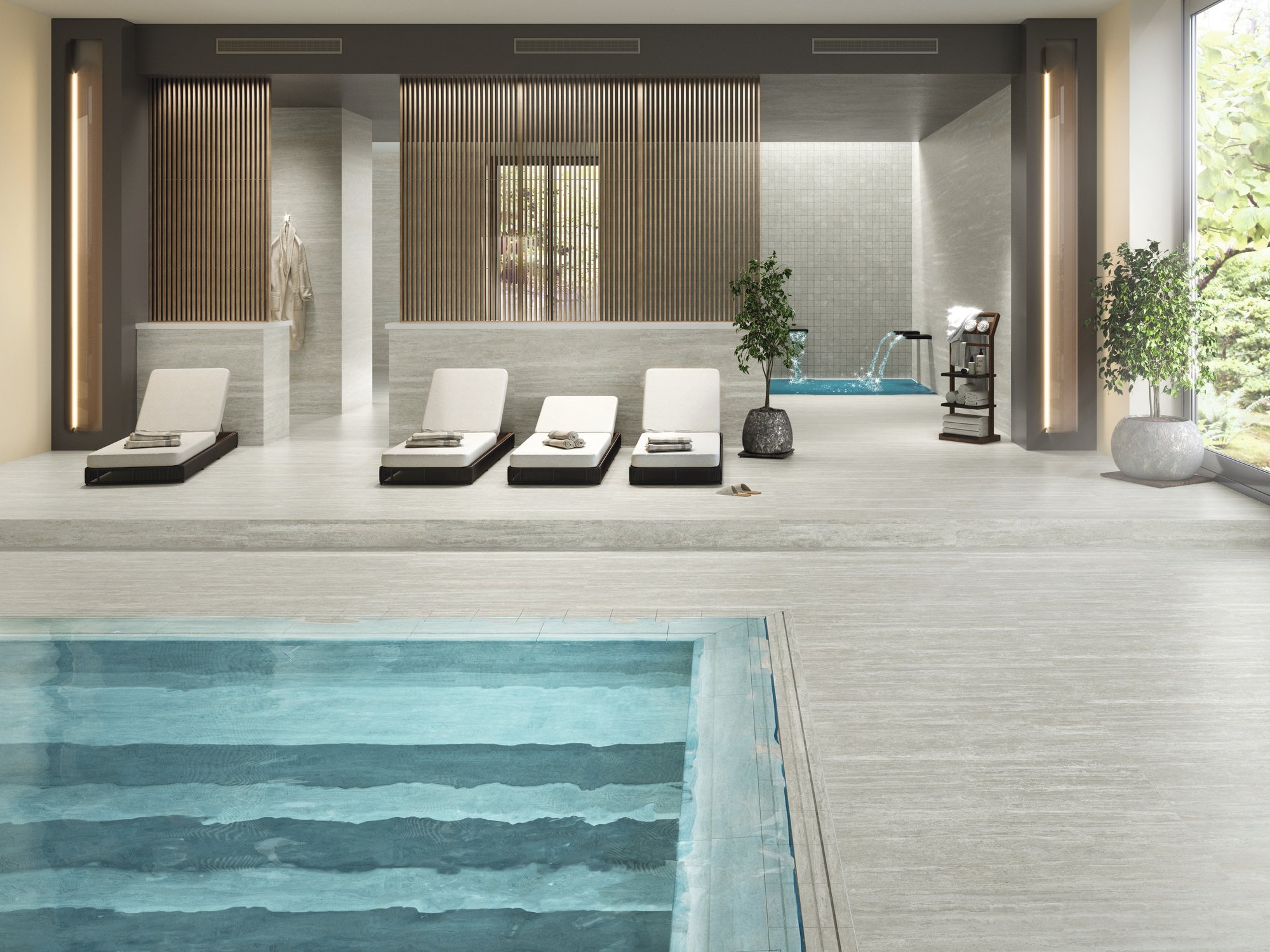 Travertino Silver es una colección inspirada en el mármol Tonos grises, Mejora la estética de todo el espacio tanto en el exterior como en el interior dándole mas fuerza .Material porcelánico apto para revestir Fachadas, Piscinas, Patios