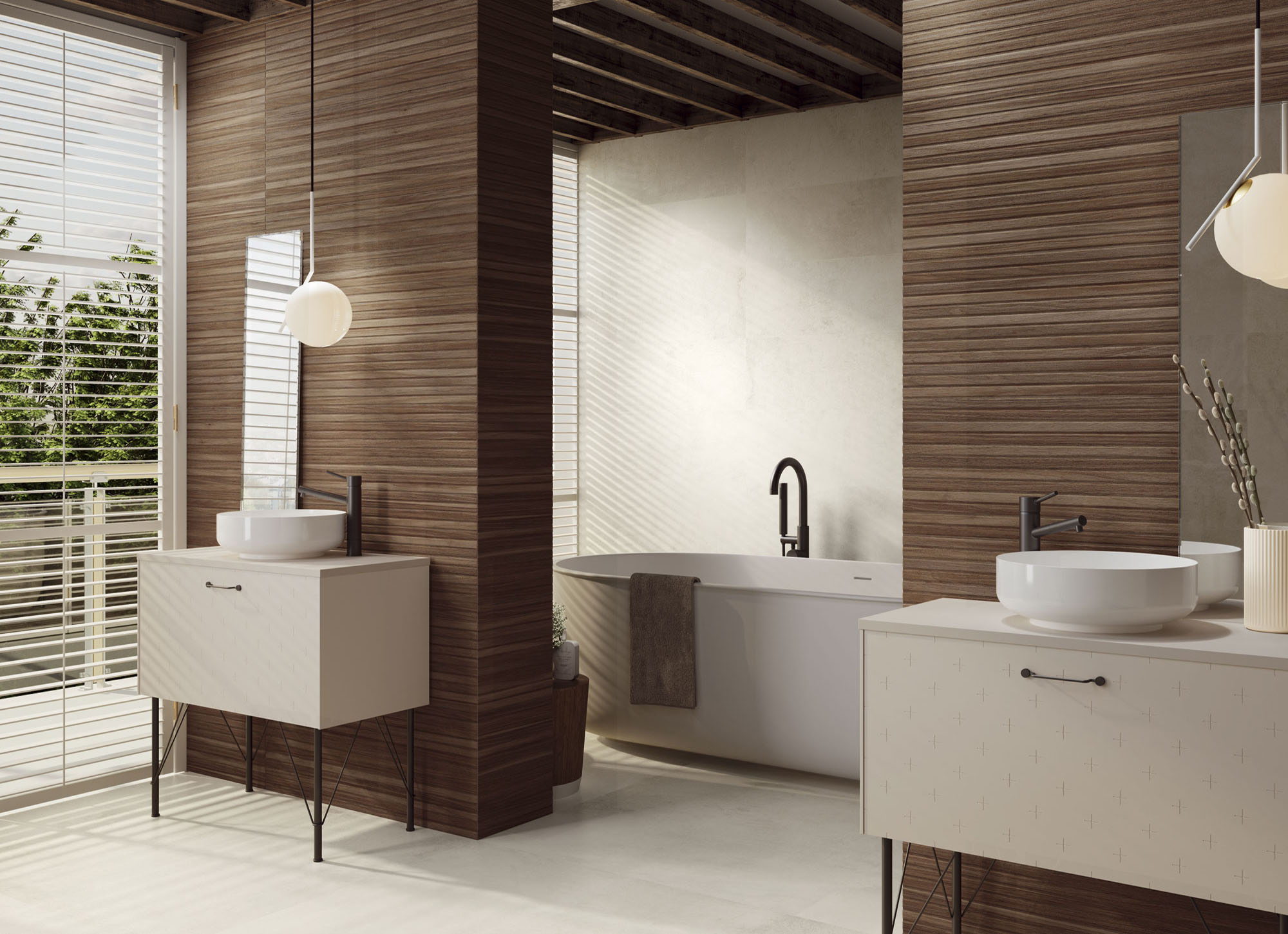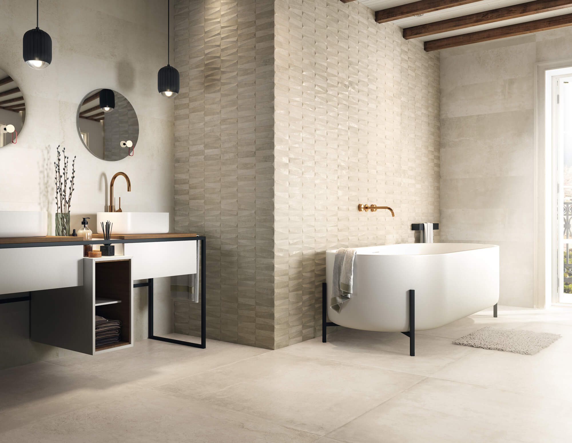 Esta colección presenta varios tamaños y acabados, incluyendo antideslizante y pulido, y colores crema, gris, nácar con un aspecto que a menudo combina la estética del cemento y la piedra.