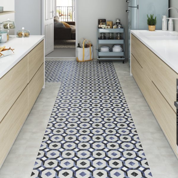 Fleur 15×15 Esta colección reproduce los efectos de las baldosas hidráulicas cementosas con un material porcelánico con altas propiedades técnicas. Las decoraciones de Fleur destaca por sus intensos colores azules y la actualización de graficas clásicas