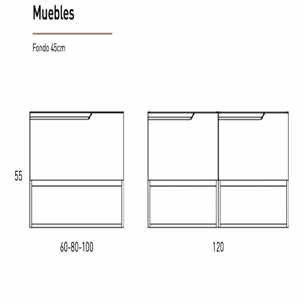 Si quieres un mueble de baño diferente y único. Lo podrás escoger en 4 medidas diferentes de ancho 60, 80, 100 o 120 cm. La medida del alto es de 55 cm y el fondo es de 46 cm y 5 colores diferentes 3 mates y 2 laminados.